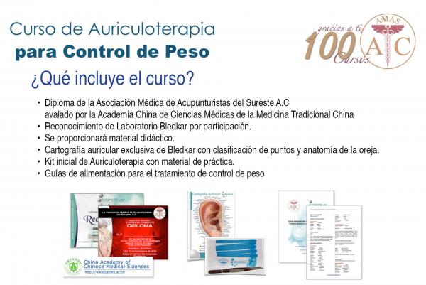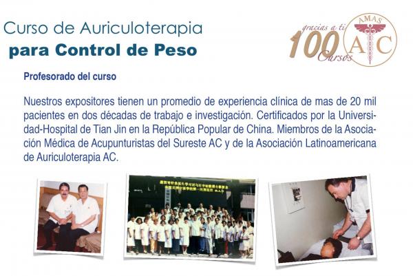 El curso “Aauriculoterapia para control de peso y otros padecimientos”, programado para el 28 y 29 noviembre 2013 en México DF e impartido por la Asociación Médica de Acupunturistas del Sureste, tiene por objetivo transmitir a los alumnos profundos conocimientos sobre auriculoterapia y medicina tradicional china.