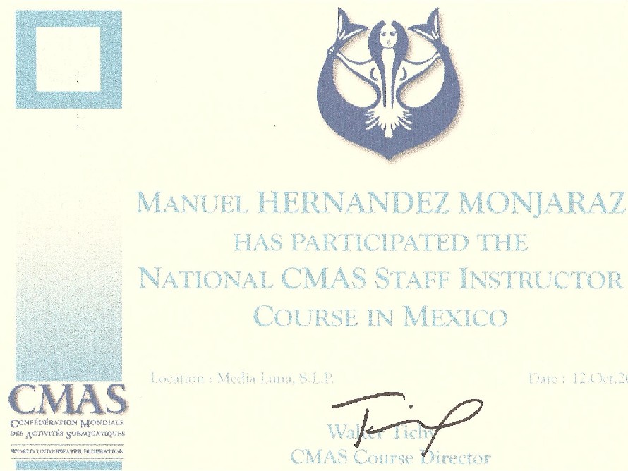 Ing. Industrial por UPIICSA (IPN) Buceador desde 1979. Instructor de buceo desde 1984. Mas de 26 cursos y talleres de capacitación en el entorno profesional del Buceo Mas de 3500 inmersiones registradas Ha inpartido cursos de buceo desde nivel básico hasta asistentes de instructor a mas de 500 personas Actualmente Dive Control Specialist Instructor (DCSI) por SSI #37327.