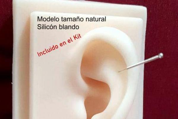 Kit básico: un modelo de oreja de silicón blando, 80 balines color piel, 20 balines tipo Swarovski, 10 balines decoración infantil, 20 tachuelas de acero quirúrgico, 5 agujas de acupuntura para oreja, pinzas pequeñas, gasas alcoholadas, localizador manual de puntos y bolsita de terciopelo. Además de algunos libros en formato digital (traer USB).