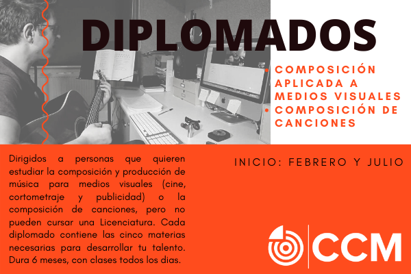 El Centro de Creadores Musicales te invita a hacerlo a través de sus diferentes diplomados en composición, los cuales están dirigidos a personas que quieren estudiar la composición y producción de música para medios visuales (cine, cortometraje y publicidad) o la composición de canciones, pero no pueden cursar una Licenciatura. Cada diplomado contiene las cinco materias necesarias para desarrollar tu talento. Dura 6 meses, con clases todos los días.